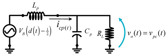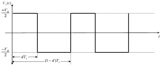The DC-AC inverter can be modeled as a half-bridge controlled by the two switches S1 and S2, obtaining an output voltage [33,34], as shown in Figure 7; where is the duty cycle and is the commutation period.