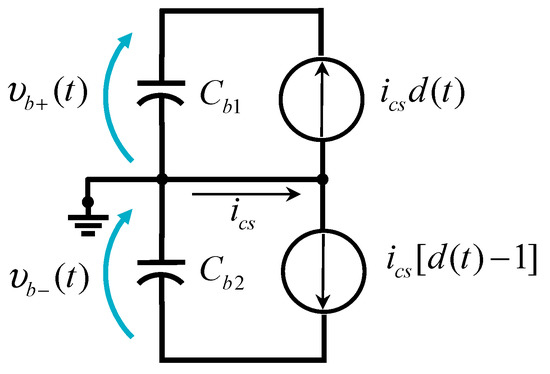 The unbalanced grid transfer function must relate the voltage difference in the capacitors to the current injected from the bidirectional inverter to them. In the circuit of Figure 9, the current through the switches S1 and S2 have been represented as two current sources feeding each capacitor, where the midpoint allows each phase to be analyzed separately.