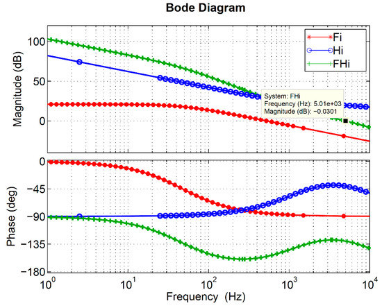 Starting from the proportional action, the controller will raise the zero-cross frequency of the system to the required 5 kHz (one-quarter of the switching frequency); the integral action reduces the error in the system and also improves the rejection of disturbances. However, the speed of response is reduced with respect to the proportional action. A pole is added to the PI controller to reduce high-frequency noise. The bode diagram in Figure 13 presents the result of applying the controller to the system.