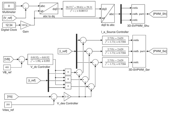 The transfer function of the shunt APF relates the output voltage with the duty cycle (see Figure 10). Additionally to the parameters defined previously for Figure 1 and Figure 4, the term , , and are the voltage in the load of the power grid; , , and are the filtered currents supplied to the load using the series APF; , , and are the capacitors of the shunt APF; - are the duty cycle for three-phase inverter; and is a voltage reference for the voltage controller.