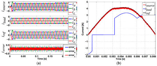 Current compensation results: (a) three-phase signals and (b) zoom of the waveform.