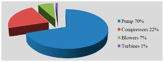 A centrifugal pump is a rotating machine used in the industry for the transfer of liquids through pipes. An unscheduled shutdown of a centrifugal pump in continuous process plants causes a huge financial loss in terms of maintenance, cost, and downtime [7]. The maintenance cost distribution for the rotating machines at a petrochemical plant is shown in Figure 1 [8,9]. It has been observed that 70% of the maintenance cost is associated with the pump. Therefore, a significant improvement in maintenance technology is required in order to reduce the maintenance cost associated with pumps.