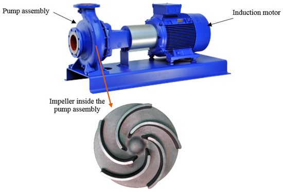 The centrifugal pump, as shown in Figure 2, mainly consists of two parts, which are the induction motor and the pump assembly. The pump assembly has a further two main parts, which are the impeller and the bearings [10,11].