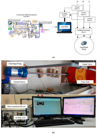 (a) The block diagram of the condition monitoring system. (b) Developed test set-up. EDT—electric diagnostic technique. LabVIEW—Laboratory Virtual Instrument Engineering Workbench; DAQ—Data Acquisition Card.