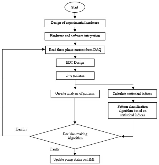 An EDT-based fault diagnosis system has been developed using components such as a centrifugal pump, data acquisition module (PXIe-1082(National Instruments, Budapest; Hungary)), Laboratory Virtual Instrument Engineering Workbench (LabVIEW), variable frequency drive (KOC100-2R2T4(Shenzhen KCLY Electric Co., Ltd, Shenzhen; China)), and current sensors (SCT-013-10(YHDC, Qinhuangdao; China), input: 0~10 A, output: 0~1 V). The current sensors are interfaced with a PXIe-6363 card, which has been installed in the chassis of the PXIe-1082. The continuous data acquisition mode of the data acquisition assistant in LabVIEW was used to collect the data. Then, 1000 samples of the three-phase stator current were collected from the current sensors at a 4 kHz sampling rate, and were analyzed in LabVIEW. The EDT was developed so as to convert the three-phase quantities into two-phase d–q quantities. These two-phase d–q quantities were transformed into d–q patterns. These d–q patterns provide a visual analysis and an indication of the pump health condition. Furthermore, an algorithm was developed in LabVIEW to calculate the statistical features (such as the shape and thickness) of these d–q patterns, and the segregation of various d–q patterns was performed based on these statistical features. The block diagram of the proposed condition monitoring system and the developed test set-up is shown in Figure 3. The centrifugal pump (JHF3X-51SAE (SAMNAN Saudi Arabia, Riyadh; Saudi Arabia), three-phase, 1.5 HP, 3450 rpm) was operated at a full speed of 3000 rpm, at 50 Hz. The flow chart of the proposed EDT-based condition monitoring system is shown in Figure 4.