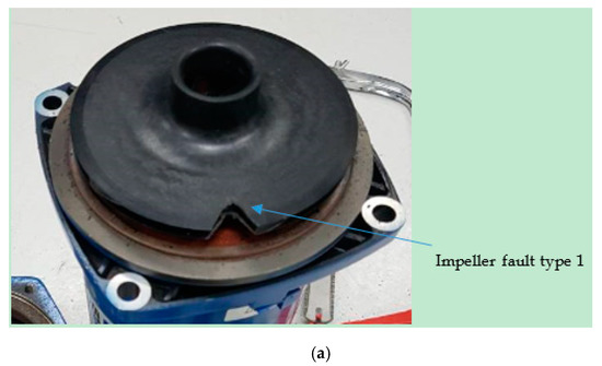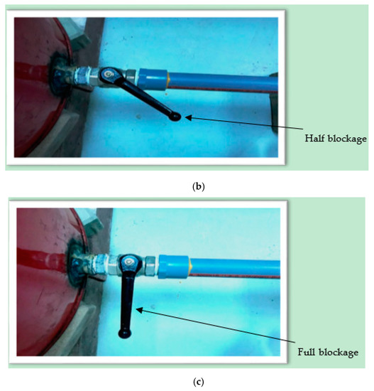 The faults in the impeller were created in the laboratory by artificial damage. Impeller fault type 1 was created by damaging the impeller surface, as shown in Figure 5. Similarly, impeller fault types 2 and 3 were created at an angle of 120°. The pipe blockages were created by closing the hand valve, as shown in Figure 6.