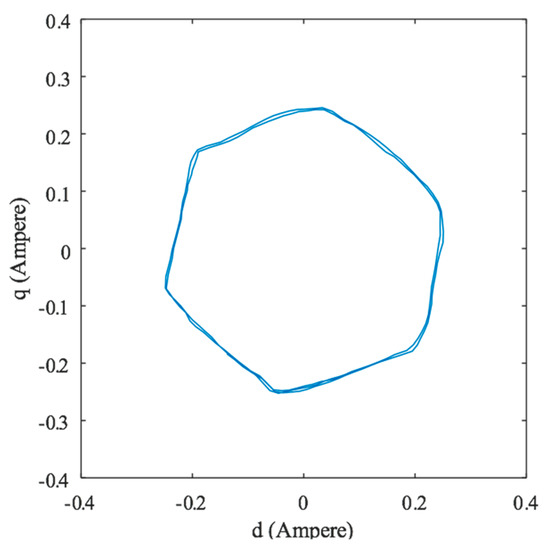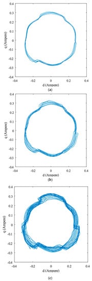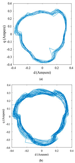 The d–q patterns of the two-phase currents were plotted using the EDT programmed in LabVIEW. The plot of the healthy pump is shown in Figure 6, and the d–q plots of the impeller faults and pipe blockages are shown in Figure 7; Figure 8, respectively.