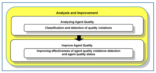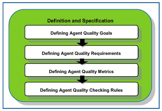 The first part of the AQM is the definition and specification process, starting with the definition of agent quality goals and criteria. Agent quality criteria are the factors that constitute high-quality agents. The existing works suggested that data quality can be defined as quality assessments performed toward several defined parameters [46,47]. In this research, the focus was toward the agent quality (non-functional) requirements during run-time. The high-quality agents were the agents that fulfilled the constraints or non-functional requirements to ensure reliability and trust between agents.