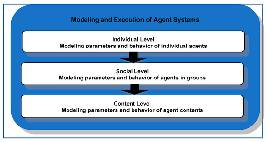 The agent systems to be verified are modeled using the AnyLogic system [40]. Each individual agent’s behaviors, preferences, and activities are modeled using state charts [48]. The creation of agents and the modeled agent activities and statuses can be executed at a specified rate and time throughout the model execution. Depending on the modeled agent systems, each agent has its own parameters and attributes. The typical agent attributes include: AgentId and AgentName. Agent social activities involve the interaction between agents to request and confirm relationship links and to share information related to profiles, relationships, online statuses, and contents. The modeled and executed agent social activities are monitored and real time agent parameters and attributes (contextual information) are tracked in order to be used during quality assessment. The agent quality depends on its own preferences and the preferences of other agents that interact with the agent. Basically, for agents that interact with each other and perform social activities, there are three layers of executions that incorporate the verification and assessment process, which are the individual level, group level, and content level. Figure 3 shows the modelling and execution phase of the AQM framework.