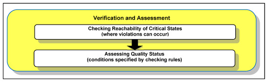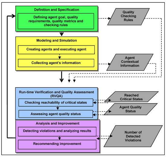 The third AQM component is the verification and assessment phase as shown in Figure 4. In this phase, a process model called Run-Time Verification and Quality Assessment (RVQA) is developed to perform the checking and assessment process. The modeled agent systems from the previous phase incorporate rules to check the reachability of critical states where violations can occur. Next, whenever the critical states are reached, quality assessments are performed to determine the quality statuses. The assessment procedure identifies the state quality conditions and assesses the quality status based on the specified checking rules. The agent quality statuses are used for classifying the agent quality satisfaction and violations. For each agent quality property level, i.e., individual, social, or content level, the total number of the detected quality violations is calculated.