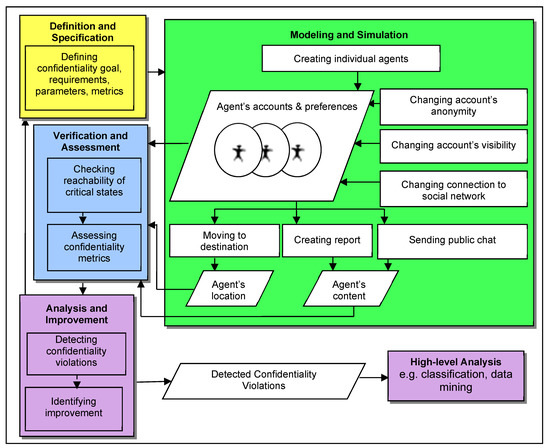 By observing the trust, privacy, and confidentiality issues from a data quality point of view, it is suggested that quality properties in smart city applications could be checked and assessed by considering contextual data. In this research, smart city applications were modeled as agent systems. During the run-time of the modeled smart city application or agent system, the effective way to assess agent quality was by performing an analysis of agent interactions and social activities. The richness of the agent data captured during those activities has opened the opportunity for granular analysis using the data at critical points during the execution. The AQM framework is designed as an extension of the generic three stages of the existing verification process, i.e., modeling, specification, and verification [45]. The framework was proposed by adapting the TDQM model reviewed in Section 2. The TDQM principle was adapted to manage agent quality within agent systems. The framework coordinates the agent quality management processes into four stages, i.e., definition and specification, modeling and execution, verification and assessment, and analysis and improvement phases that can be implemented as a cycle. AQM checks and assesses the agent quality conditions in selected critical states and transitions. The quality checking process includes continuous monitoring during run-time in order for the quality specifications to be verified by considering contextual information, i.e., relating the agents to their individual profile status, social preferences, and content sharing activities that may affect agent quality properties.