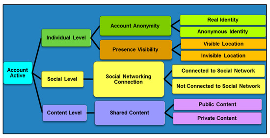 Every active agent discloses a certain level of data depending on agent conditions at (1) the individual level, depending on the account anonymity and presence visibility; (2) the social level, depending on the social networking connection; and (3) the content level, depending on the shared content types. The definition of agent confidentiality requirements and the possible violations for confidentiality criteria, the extracted metrics with attributes, and the constructed checking rules for each of the confidentiality metrics have been specified and reported [51]. Figure 8 summarizes the identified contributing factors or conditions of data confidentiality disclosures in the CNS. The contributing factors can be divided into three levels, which are the disclosures at the individual, social and content levels.