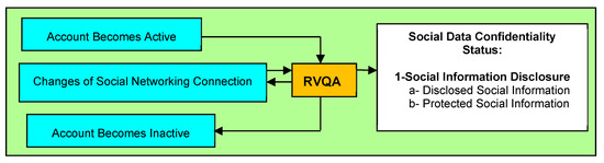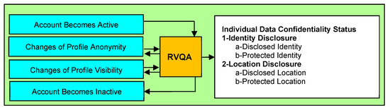 Figure 9 shows individual agent activities and the implementation of the RVQA to check an agent data confidentiality disclosure status during an agent active period. The individual agent activities include the stage when the agent account becomes active, the dynamic changes of agent decisions toward profile anonymity and presence visibility throughout the agent active period, and the stage when the agent account becomes inactive.