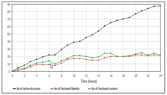 Figure 12 shows the number of disclosed agent identities and locations as compared to the total number of registered active accounts throughout the execution period. This time graph represents the agent data confidentiality violation detection results at the individual level. For each agent account, the agent anonymity could be either a real identity or anonymous. At the same time, the agent’s presence visibility was either visible (location was disclosed) or invisible (location was protected). At the end of the 24-h execution, out of all the registered agent accounts, about 20% of the agent identities and 20% of agent locations had been disclosed to the public. According to the defined requirements, disclosing the agent identity, location, or both to the public violates agent data confidentiality. These information disclosures to the public were due to agent preferences that revealed the agent identity and made the agent’s presence (location) visible to the public during the run-time.