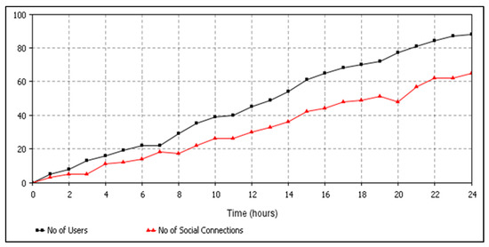 Total number of active accounts and the number of detected social connections versus time (hours).
