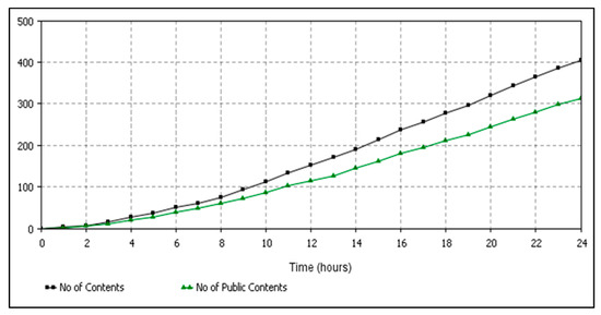 Finally, Figure 14 presents the amount of disclosed contents. This time graph represents the result of agent data confidentiality violations detected at the content level. At this third data confidentiality level, about 80% of shared contents were disclosed to the public. These content disclosures occurred when agents shared public contents, such as traffic reports. These types of disclosures reveal an agent’s account and risk other disclosures, such as their identity and location.