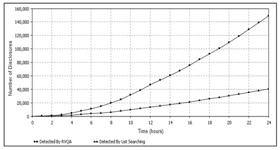 This section compares the results of the agent data confidentiality violation detection and classification using the RVQA against the detection using the CNS Searching process explained in Section 5.1 and Section 5.2, respectively. The total numbers of data confidentiality violations detected by both methods throughout the CNS execution period are shown in Figure 15. At the end of the 24 h of execution, the RVQA detected a 72.45% higher number of violations as compared to the CNS Searching process. The total number of violations detected by RVQA was 137,373, while 37,851 violations were detected by the CNS Searching process. The result shows that the implementation of the AQM framework and the RVQA process helped to detect about 70% more agent quality violations that occur during the execution of CNS as compared to the detection performed using the CNS Searching process. One of the main reasons is that more agent data confidentiality requirements and rules can be defined and implemented via the AQM framework and RVQA process. As a result, more agent data confidentiality violation conditions can be detected.