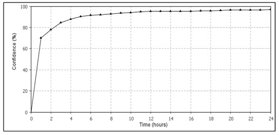 Figure 16 shows the confidence of the RVQA results throughout the 24 h of the CNS execution. From the start, the graph shows a highly increased confidence percentage. The graph then gradually increases and stays constant above 95% as more than 95% of the subsequent detected data confidentiality violations were known violations that were expected to be detected. However, during the classification of violations, RVQA managed to include violations that were not in the list of expected violations. For example, RVQA classified all the disclosed locations as data confidentiality violations, while the list of expected violations only considered location disclosures as data confidentiality violations when the agent identity was also disclosed. The confidence percentage was expected to stay constant. This result, however, can be improved upon if the data confidentiality requirements and checking rules at the AQM definition phase are refined in order for all the data confidentiality detections to become the correct or expected detections (when compared to the known data confidentiality violations).