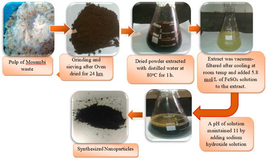 To minimize the operational cost of the adsorption process, the adsorbent was prepared from agricultural waste. As a source of low-cost agricultural waste, the pulp of sweet lime waste was obtained from a local juice center. This pulp was initially oven-dried for 24 h, followed by grinding and sieving through 45–100 mesh. Then, 15 g of dried powder of sweet lime pulp was added to 250 mL of pure distilled water. This solution was thoroughly mixed in an orbital shaker at 100 rpm and heated at 80 °C for 1 h. Then, the solution was cooled to room temperature and vacuum-filtered to obtain the extract. Citrus fruits extracts are reported to contain several biomolecules such as flavonoids, alkaloids, antioxidants, and other phenolic compounds [25]. These compounds are also reported to be good reducing agents [26], which reduce metal ions. nZVISLP synthesis was done using the method described by Gautam et al. [19], through the addition of FeSO4 solution (5.8 mol/L) to the sweet lime pulp extract in a ratio of 1:3 (v/v). Upon the addition of sweet lime extract to the iron solution, the solution color changed from brown to black. The pH of the solution was then adjusted by adding NaOH. During this procedure, all metal ions were rapidly transformed into nano-metallic particles due to the addition of NaOH, and the mixture became black. These particles were separated by centrifugation. Then, the black particles were vacuum-dried for 24 h at 50 °C, and stored in a vacuum desiccator before further use for MB adsorption. The various stages of nZVISLP synthesis from sweet lime waste pulp to iron particles are shown in Figure 1.