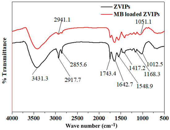 The FT-IR spectra of synthesized nZVISLP and MB-loaded nZVISLP are presented in Figure 2. Figure 2 reveals many absorption peaks, suggesting the complex structure of the nanomaterial. The broad peak at 3431.3 cm−1 was due to the stretching vibration of the bond for the existence of –OH functional groups on the nZVISLP surface. The sharp adsorption peaks at 2855.6 and 2917.7 cm−1 were attributed to the symmetrical vibration of –CH2 and asymmetrical vibration of –CH3, respectively. The symmetric and asymmetric bending vibrations of –CH3 and –CH2 were further confirmed by the presence of peaks at 1417.2 and 1337 cm−1, respectively. The influential band at 1642.7 cm−1 was due to the vibration of –C=O from a carboxylic acid. The peak observed at 1548.9 cm−1 was due to the existence of aromatic rings. The sharp tiny peaks observed at 1012.5 cm−1 were attributed to the bending vibration of –OH and stretching vibration of –C–O–C– in the lignin structure of the material. As presented in Figure 2, for the MB-loaded nZVISLP, the peak of the stretching vibration of –OH groups at 3431.3 cm−1 shifted to 3419 cm−1, whereas the peak representing the –C=O stretching vibration of carboxylic acid with intermolecular hydrogen bonds also shifted from 1642.7 to 1646 cm−1. The symmetric and asymmetric vibration peaks of –CH2 and –CH3 also shifted to higher wavelengths after MB loading. These results indicate that the active sites including –OH and –C=O groups existing on the surface of the material may lead to the potential removal of a cationic dye, such as MB [29], along with iron particles.