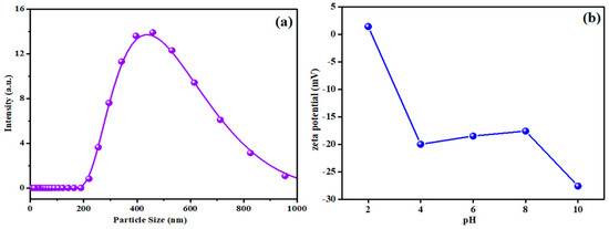 The particle size of the sweet lime synthesized adsorbent was determined using a Zeta nanosizer (Nano-ZS90, Malvern, UK), after homogenization in C2H5OH at room temperature. The results obtained are presented in Figure 4a. This profile indicates a broad peak between 200 and 500 nm. The zeta potential of nZVISLP was also determined using the same equipment. The result of the zeta potential analysis is shown in Figure 4b. The magnitude of the zeta potential defines the stability of the adsorbent in a dispersion medium. It signifies the electrostatic repulsion between the adsorbent and the dispersion medium [32]. The result indicates that the magnitude of zeta potential increased at higher pH, depicting that the synthesized adsorbent was stable at higher pH.