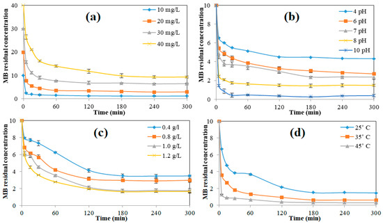 The effect of nZVISLP dosage on MB adsorption was also systematically investigated by varying the amount of nZVISLP from 0.4 to 1.2 g/L, keeping other process parameters at fixed values (pH: 8, C0: 10 mg/L, and temperature: 25 °C). Figure 5c shows that the adsorptive removal of MB increased from 71–86% with the increase in nZVISLP dosage from 0.4 to 1.0 g/L, as evidenced by the C0 value changing from 3.4 ± 0.2 to 1.6 ± 0.1 mg/L,. With a further increase in dosage (up to 1.2 g/L), there was no substantial increase observed in MB removal. Upon increasing nZVISLP dosage from 0.4 to 1.2 g/L, qmax values increased from 6.5 ± 0.2 to 8.2 ± 0.01 mg/g. Upon increasing adsorbent dosage, the surface area available for adsorption increases, which then enhances the adsorption [41]. Li et al. [39] also reported a similar trend for MB adsorption. However, a further increase in dosage did not influence the removal rate, due to the unavailability of adsorption sites [38].