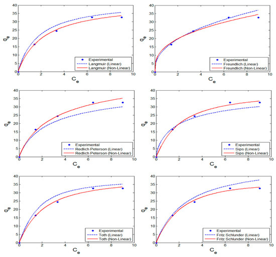 To get insight into the adsorption mechanisms of nZVISLP for MB removal and to verify the performance of the adsorbent, various isotherms, as indicated in Table S1 (Supplementary Materials), were validated. The isotherm parameters were evaluated using DEO with an objective function to minimize statistical metrics including χ2 and RMSE. The performance of the optimal isotherm parameters is presented in Figure 6. These results indicate that linearizing the non-linear equation underestimated the features of the actual isotherm. It can be observed that the values predicted by DEO using optimized parameters were pretty close to the experimental values. To further confirm the performance and verify the statistical significance, the previously discussed prominent statistical metrics were evaluated and compared for both linear and non-linear model forms, as shown in Table 2. Again, these results further indicated that the parameters estimated using the non-linear model provided a higher R2. For all the evaluated isotherm models, R2 was higher than 0.94, and the R2 values for the Freundlich and Sips isotherm models were close to 0.98, thus validating their better description of nZVISLP adsorption characteristics for MB removal. Another essential statistical metric, χ2, indicated that the values were ≥0.98, thus confirming the suitability of these isotherms. All other significant statistical measurements that were evaluated showed a similar trend. As a result, the optimal isotherm parameters estimated by implementing DEO better captured the adsorption process of MB onto the surface of nZVISLP.