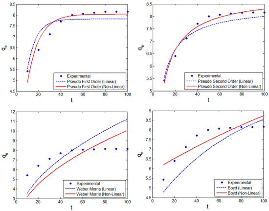 In this research study, four kinetic models, shown in Table S2 (Supplementary Materials), were evaluated. Most researchers estimated the parameters in kinetic models by linearizing them and applying traditional least square regression methods. As explained in the previous section, equilibrium values predicted from these models give inferior values. Therefore, to overcome the undervaluation and retain the non-linearity associated with the process, the abovementioned DEO technique was also implemented to evaluate the intrinsic parameters; thus, the most suitable kinetic model could be identified.