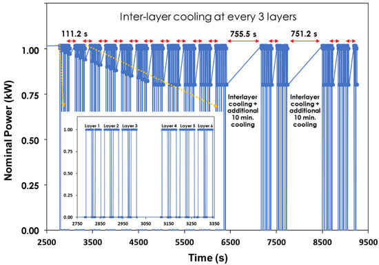 Estimation of layer deposition time from the measurement. There is additional cooling time at 34th and 40th layers to prevent the build overheating. Inlet shows the power variation at the layer 1~6.