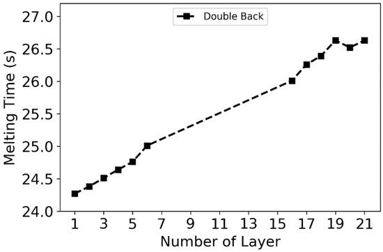 A characteristic melting strategy used in the experiment and simulation is presented in Figure 2. In the experiment, the beam moved backward by 10 mm for the first layer and then increased the distance by 1 mm per layer, up to 20th layer. This backward melting with addition of material was designed to recover the declined deposit edge of the wall, i.e., part slumping. The backward melting (i.e., double-back) became a constant of 30 mm from 21th layer onward. The double-back time continuously increases by roughly 0.125 s up to 20th layer.
