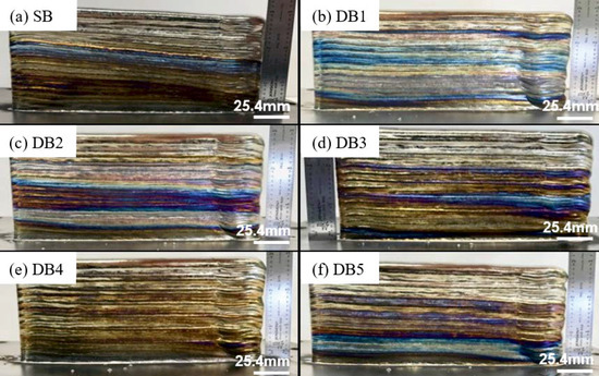 Six walls were built to investigate the effect of interlayer cooling time and constraint on the part deformation: a single bead (SB), three double beads (DB) with full clamp (bolted at every other hole) and two DB with center clamp conditions (bolted at two center holes). Three interlayer cooling times of 0 (=DB-1), 2 (=DB-2) and 4 (=DB-3) min were tested for the full clamping condition, and the two interlayer cooling times of 4 (=DB-4) and 0 (=DB-5) min were tested for the center clamping condition. The experimental conditions were summarized in Table 1 below. Figure 3 shows the deposited single and double walls with 0-, 2- and 4-min interlayer cooling time.