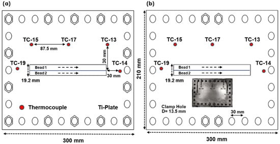 The schematic of the build geometry and the location of thermal couples are given in Figure 4. Ti-plate has 30 clamp holes each with a diameter of 13.5 mm. The full clamp condition had bolts at holes as shown in Figure 4a, while the center clamp condition had bolts only at the two center holes, as in Figure 4b. Five thermo-couples were inserted into the drilled holes on the Ti-plate to capture temperatures during and after the printing process. K-type thermocouples were used with a measurement uncertainty of 2.2 °C, or 0.75%. The Ti-plate was clamped to a 50.8 mm thick steel plate.