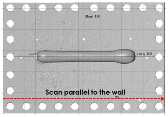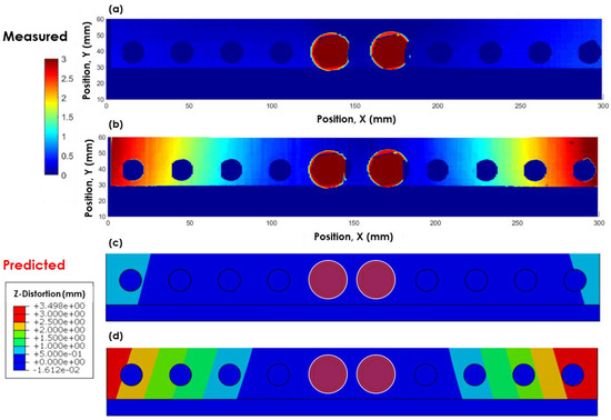 Figure 11 shows the measured and predicted distortion in a color plot after the completion of the first and last layers at the edge of the DB-4 build plate. The thicker red color represents a higher distortion in the plate. The two red circles at the plate center are the clamp bolts that were placed on the top of the plate, because the laser scanner measured a high distortion value for the bolts. Approximately 3.3 mm of distortion was observed at both side edges of the plate, as shown in Figure 11a,b. The distortion progressively decreased towards the center of the plate, and became almost zero at the center region, because of the bolt clamps. This trend was well captured by the prediction in Figure 11c,d.