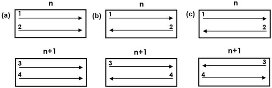 One of the critical process parameters associated with deposit quality is a tool path, because it guides the motion of the laser head [2,27,28]. Characteristic features of a tool path, such as discontinuous deposition, sharp turns at the edges of a given geometry, and overlap ratio can lead to defects, non-uniform stress distribution and part failure. Figure 7 illustrates three different tool path designs commonly used in LMD-w. The letter n indicates the current layer and n+1 represents the subsequent layer. The deposition repeats the sequence of 1→2→3→4 until the end of the process. A unidirectional path, as in Figure 7a, is the simplest and most common tool path [29]. The print head always moves from the left to the right direction at every layer. A bidirectional path, as in Figure 7b, alternates the direction at every track on a layer. It potentially generates a uniform temperature distribution at the left and right edges, but it may produce overheating at the corner due to sharp turns. The last path strategy is a bidirectional path with 180° rotation at every layer, as in Figure 7c. It can avoid the accumulation of overheating caused by a repeated starting location. For instance, track 3 is melted at n+1th layer but is next to track 2 of the previously deposited nth layer.