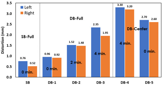 Six walls were built with different interlayer cooling times, and the effect on part distortion is shown in Figure 8. For the double beads (DB) condition, 0 to 4 s interlayer cooling times were examined. The plate deformation increased with increasing interlayer time in DB, regardless of the type of constraint. Larger distortion was observed under center clamp than full clamp conditions. The literature shows that the distortion and residual stresses strongly depend on the clamping conditions [30,31]. The distortions on the left and right sides of the plate could be asymmetric due to unidirectional tool path.