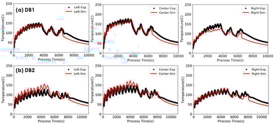 Validation of plate distortion (blue = simulation and red = experiment). (a) DB-1 with 0 min and (b) DB-2 with 2 min interlayer cooling time. The magnitude of distortion became larger with increasing interlayer time.