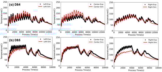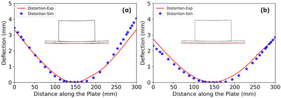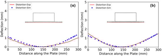 Validation of plate distortion (blue = simulation and red = experiment). (a) DB-4 with 4 min and (b) DB-5 with 0-minute interlayer cooling time. The magnitude of distortion became larger with increasing interlayer time.