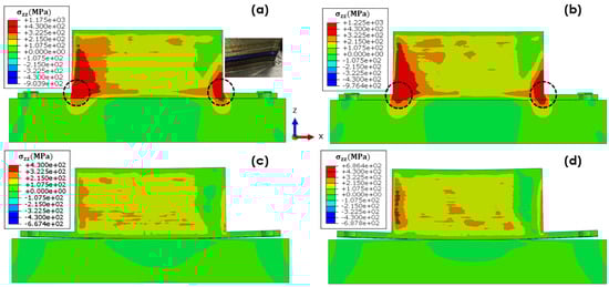 Residual stress prediction at the end of printing in full clamp of (a) DB-1 with 0 min and (b) DB-2 with 2 min interlayer cooling time, and center clamp of (c) DB-5 with 0 min and (d) DB-4 with 4 min interlayer cooling time.