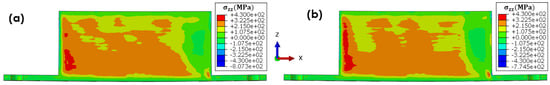 Stress distribution after releasing the constraints at (a) DB-1 with 0 min and (b) DB-2 with 2 min interlayer cooling time.