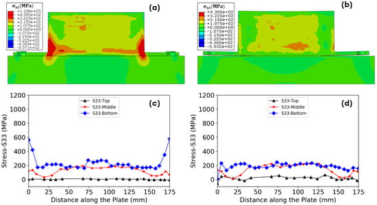 Figure 14 represents the predicted normal residual stress (=) in the z-direction contours of the Ti wall and plate before and after the restraints were released from the plate. The residual stress contour for DB-1 is shown in Figure 14a,c and the contour for DB-2 is shown in Figure 14b,d. The residual stress was generally tensile over the wall. Notice that stress concentrated at the corner of the Ti-wall and -plate interface during cooling in Figure 14a,b, and then decreased when the bolts were released, as shown in Figure 15a,b. If the tensile stress is high enough in other parameter conditions, the corner would possibly be a visible cracking initiation spot (inset in Figure 14a). The stress distribution of DB-2 was similar to that of DB-1. However, the maximum value of the residual stress was approximately 30 MPa higher in DB-2 than that in DB-1. Moreover, higher contour values, in orange and red color, were observed in a wider area in DB-2. It can thus be concluded that shorter interlayer cooling time not only produced less distortion but also lowered residual stress.