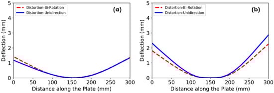 Comparison of the predicted distortions from the bidirectional tool path to the distortion from the unidirectional tool path in (a) DB-1 and (b) DB-5.