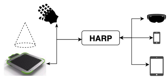 Moreover, both prototypes presented in this paper are limited to only one haptic device (Ultrahaptics UHDK5). Nevertheless, the HARP architecture allows adding more instances of the Haptic client, each one of them associated with its own haptic device and with its own implementation. This opens the door to future scenarios in which various haptic devices can cooperate. An example of this may be, for example, that while a user is receiving feedback from Ultrahaptics, more external information is provided through haptic clues by a smartwatch.