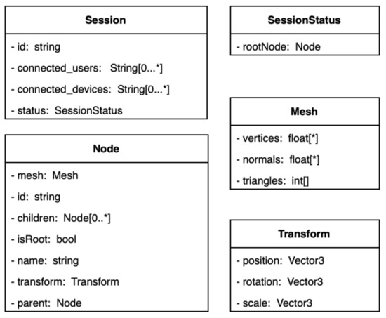 A pillar of the proposed architecture is its data model. It is built on an adaptation of the one used by most 3D development tools, so it allows a great flexibility. When integrating the HARP architecture in different platforms, the translation from their inner representation to our proposal will be practically direct. The key concepts on which the data model is built are sessions and nodes. Figure 4 shows a class diagram with the main entities that the system manages. A session has users and devices connected to it (Figure 4). A device will be each client that participates in the process of augmenting AR through haptics. For example, one client may represent the application that acts as a bridge with the haptic device and another client may be the one with AR capabilities. Later on, when the components of the architecture are presented, this concept will be revisited.