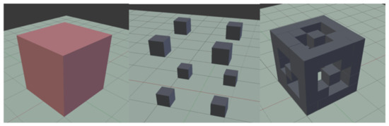 If the objective is to perform a volume-based representation, the more detail the representation offers, the more details the user may appreciate. In this case, hand information was introduced into the system using the Leap Motion device integrated on the Ultrahaptics and the generation process suffers certain alterations. In this case, the first step is to divide the 3D model into slices. To do so, we created a logical representation of the 3D shape and encoded it on a 3D matrix. That matrix can be seen as a discretization of the space over the Ultrahaptics, with each cell in that matrix representing a position on the 3D space over the device. For each one of these cells, it is stored as a Boolean value whether it should be represented or not. The more resolution the matrix has, the more details will be perceived by the user. After, the next step is optional. For every triangle of the model, we stored its edges information. If the edge collides with the slice plane, the collision point is marked to be represented. Finally, only the slice in which the user’s hand is positioned gets represented. By using this method, the edge information can be easily integrated in the representation and only those points which can be really perceived by the user are shown. Figure 8 shows a schematic vision of how this process works. A red cube appears in the left side of the figure from which the haptic representation will be generated. In the center of the figure appears the representation of the 3D matrix in which only the vertices information has been stored. In the right-most side of the image appears the matrix representation including all the information relative to the triangles of the figure. Each dark cube represents a cell on the matrix, and it will be perceived by the user as a haptic point.