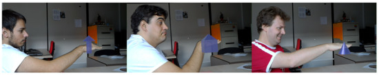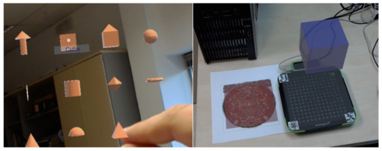 When interacting with computers or machines, natural interaction usually refers to the final goal of the user experience that aims at being smooth, easy, and evident, i.e., natural to the user. However, natural interaction is a subjective concept [4] that can be applied to a wide range of fields. This is mainly due to different users having different preferences, expectations, and background. Several studies have been conducted regarding the interaction with virtual content without hands, that is, without direct contact from the user. Some approaches [5,6] have made use of users’ gaze to show or hide information when using AR displays. It has also been studied whether the use of head gazing or eye pointing [7] is more effective when interacting. Results indicate that users tend to prefer the head approach because of its better stability. Given that this type of interaction is quite widespread, some frameworks such as EyeMRTK [8] have been appearing to facilitate developer tasks. The survey by Mohamed Khamis et al. [9] collects the history and current situation of gaze-enabled interaction in the context of mobile handheld devices. Finally, a survey about interaction methods for head-mounted displays that emphasizes touch and touchless-based interaction can be found in Reference [10]. Regarding direct manipulation, users may apply actions over elements like “touching” or “moving”. In the end, the better the interaction adapts to what the user expects, the more natural it will feel. Hence, different systems and devices may offer different natural ways to interact with them. In wearable AR context, the use of hand gestures has been widely explored [11,12]. Thanks to the apparition of more powerful devices, nowadays, it is possible not only to detect gestures but also to perform image analysis techniques in real time and to track hand movements (e.g., Kinect and Leap Motion [13,14]). The preference of users for certain gestures has already been explored in previous works [15]. Nevertheless, the interaction with the virtual content is not natural yet. This is mainly due to one key component that has not been systematically integrated into this interaction: tactile feedback. The concept of haptic feedback promises to tear down the boundaries between the real, physical world and the virtual one. The combination of hand gestures and haptic feedback is positioned as a middle ground between precision and comfort, and its advantages have already been explored in the literature [16].