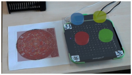 In this prototype, a user equipped with HoloLens can haptically inspect a 3D object. By inspecting, we understand to visualize the digital AR 3D model over the UHDK5 and to perceive it in the hand thanks to the haptic feedback. Because we seek to offer a haptic representation as accurate as possible, the high-fidelity representation has been used. The application works as follows. First, the user can select a 3D model from an AR menu, which is displayed through HoloLens in front of them. The left side of Figure 9 shows some of the available options in the system. Once a 3D model has been selected, the system generates the proper haptic representation aligned with the AR object over it, as shown in Figure 9. As can be seen in the Figure, a red AR square has been placed over the 2D physical mark to show the automatic alignment process. From here, the user can now inspect the HARptic element or select another one to explore.