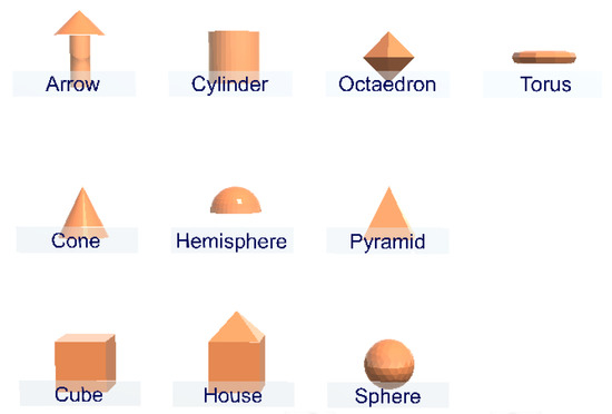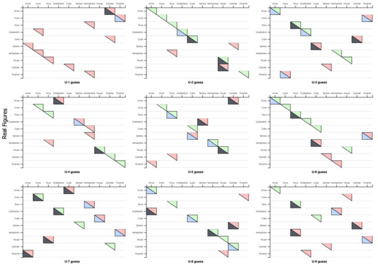 Figure 18 shows the performance for each participant and the relationship between the figures perceived by users as more difficult (black lower triangle, labeled as 1/5) and easier (blue lower triangle (5/5)) and their actual results (upper triangle in green is a hit, while red is a fail). It would be expected that most hits have occurred over figures labeled as easy, with failures concentrating on those labeled as difficult to interpret. Taking for example the participant U7, we can see that the three figures that the user found easy to interpret (hemisphere, house, and pyramid), were not afterwards guessed. However, two of the figures that the participant said were hard to interpret were two hits (cone and octahedron). In general, it seems that users’ perception of figures that are easy and difficult to interpret does not correspond to the results obtained. However, it seems that there is a set of figures that are the most successful in general (cone, house, and torus). We have grouped participants into two groups y taking into consideration the number of hits (G1: ≥5 hits; G2: <5 hits). A Shapiro test is carried out over the hit frequency, and the test cannot reject the null hypothesis of normality for the distribution (). Then, a Welch Two Sample test for unequal variances cannot state a real difference in performance between the two groups.