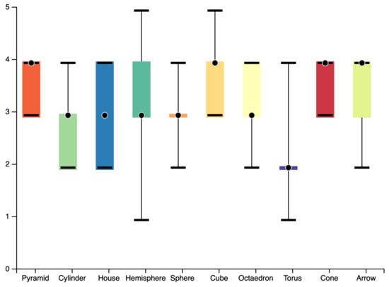 Figure 14 shows a box plot of the interpretability value given by the users to each figure. In the image, median values for each figure are represented as circles. As it can be seen in the image, the figures that present a greater disparity of results are the hemisphere and the torus. On the contrary, figures in which the users have most agreed are the pyramid and the cone.