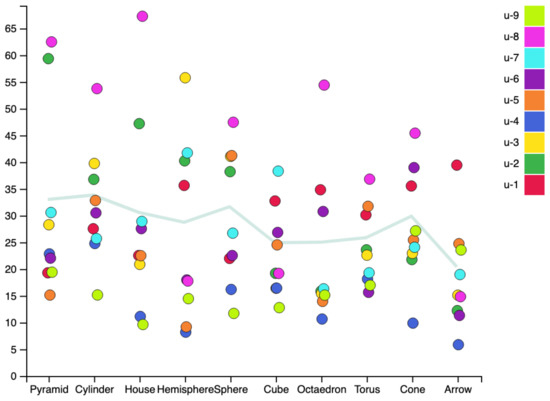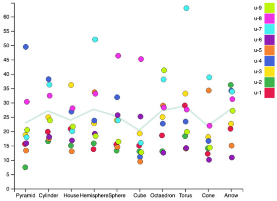 Figure 15 gathers the times required by each user on Task 1 since they begin to explore the figures until they form an opinion about it. The light blue line shows the average times for each figure. Times required by users range between 5 and 65 s. There is a statistically significant difference between inspection times among users, as revealed by a one-way ANOVA test (, p<<). A Tukey post hoc test shows that the inspection time was significantly lower for U1, U2, U5, and U6 when compared to U7 and U8.