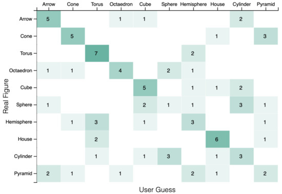 Figure 17 presents the confusion matrix between the correct answers and the participants’ guesses in the form of a heat map. In the vertical axis appears the correct answer, and in the horizontal one appears the user guess. On the diagonal of the matrix, the number of right answers for each figure can be seen. The more green a cell is, the more users guessed correctly that figure. As can be seen in Figure 17, the cone has been guessed properly 55.5% (5/9) of the time, while the torus has the most hits with 77% (7/9). The house on its side has been properly guessed the 66.6% (6/9) of the time. Although users have indicated that haptic feedback is not enough to identify figures, the data indicates that this is possible. In fact, by choosing a set of easily recognizable and non-misleading figures (e.g., cone and pyramid), it would be possible to transmit graphic information to the user in a haptic manner. The presented matrix serves as a guide to select that hypothetical set of figures.